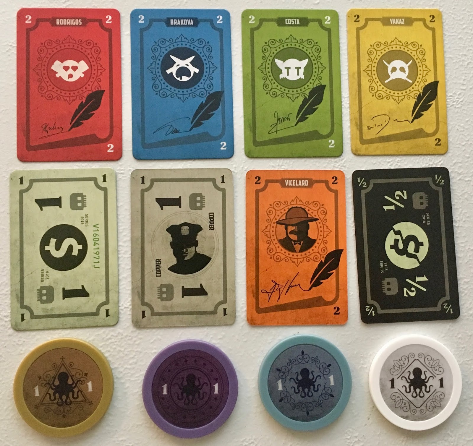 Les cartes contrat valent 2 points, les jetons influence valent 1 point, les cartes dollar valent 1 point et le dos de toutes les cartes valent 1/2 point.