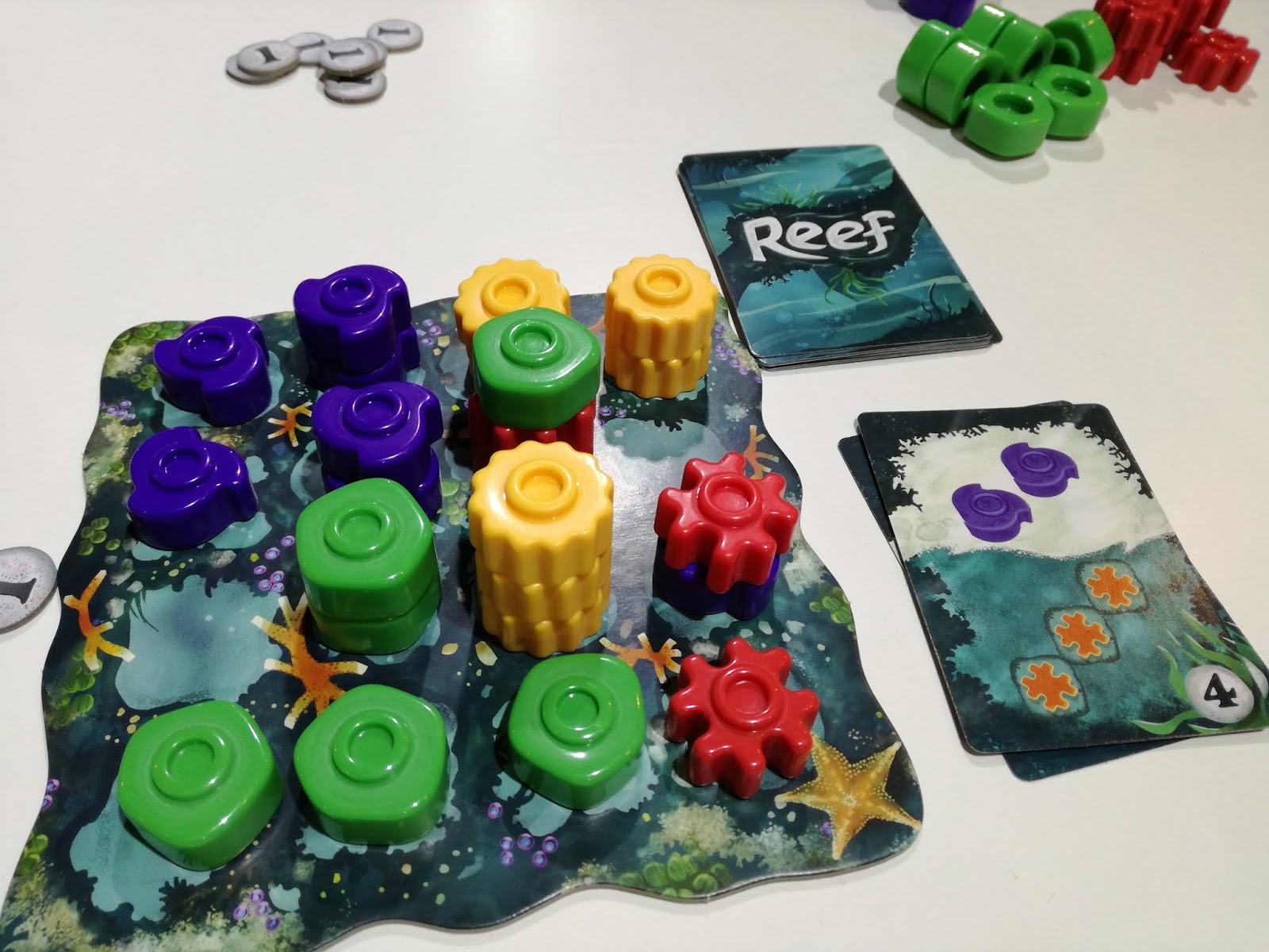 #Reef : j’ai fui un Azul et je me suis retrouvé à jouer avec des coraux. Al’ l’avait également mentionné, à Essen cette fois. Reef est un petit jeu de stratégie où soit l’on prend une carte (parmi 3 possibles) ou soit l’on joue l’une de ces cartes. Jouer cette carte nous permet de poser les coraux indiqués ET de scorer la condition de victoire indiquée. Mais généralement, l’un est sans rapport avec l’autre : nous allons poser des coraux rouges pour scorer sur nos piles de coraux verts. Bref, il faut anticiper; c’est plutôt très malin.
