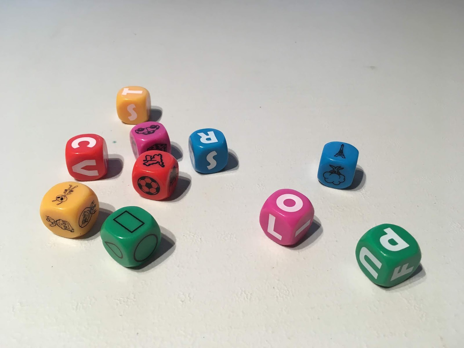 Vous disposez de 5 dés de couleurs différentes contenant des lettres, et 5 dés de mêmes couleurs contenant une image, qui représente un thème.