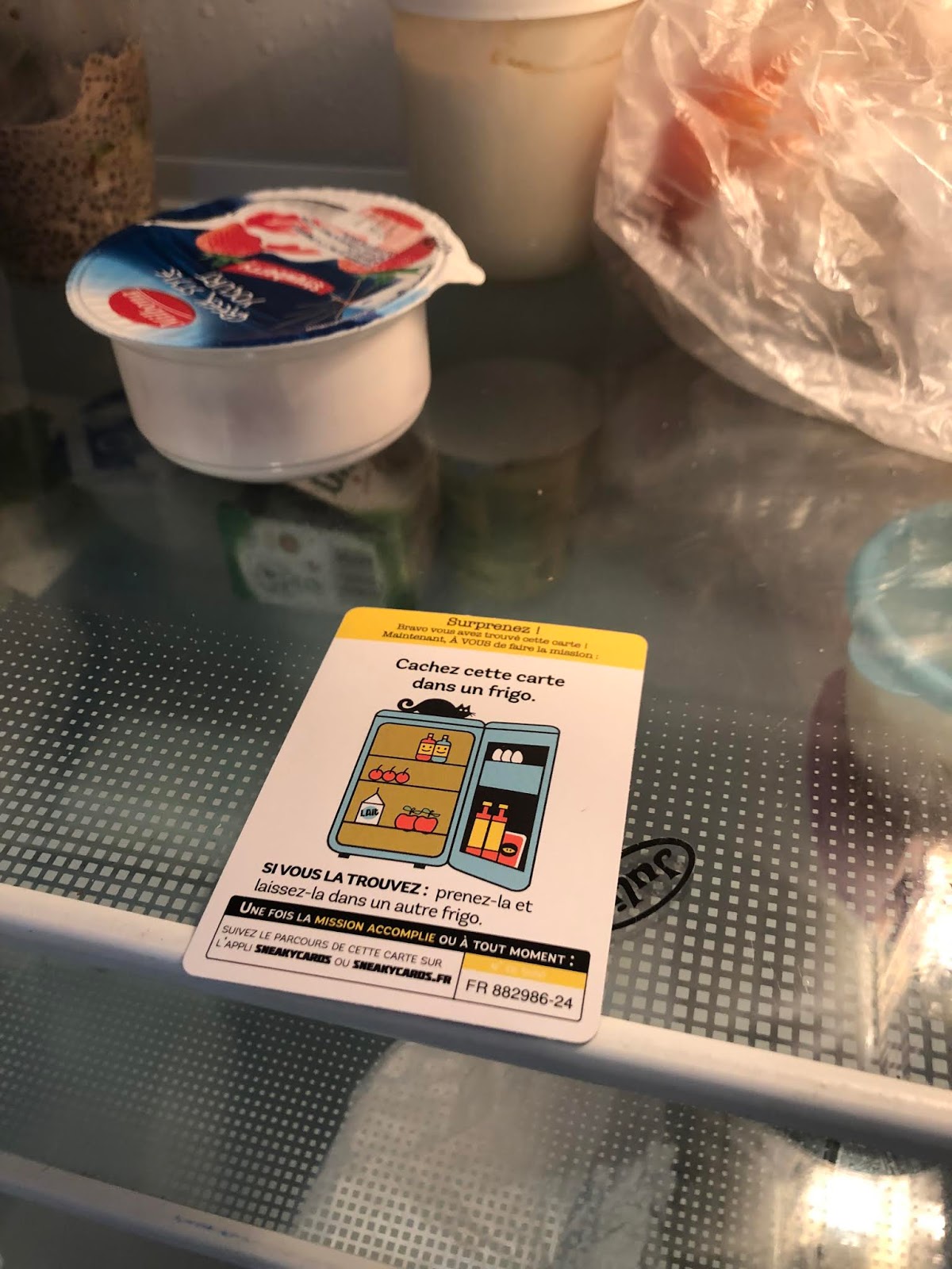 Cartes jaunes – Surprenez : pour cette catégorie, nous abandonnerons nos cartes dans différents lieux afin de mieux surprendre les personnes retrouvant nos cartes. Parmi les défis de cette catégorie, j’ai notamment laissé une carte dans un frigo commun en entreprise. J’ai eu le plaisir quelques jours plus tard d’apprendre que sa découverte avait illuminé la journée du nouveau joueur à se demander où il allait pouvoir la placer lui-même…