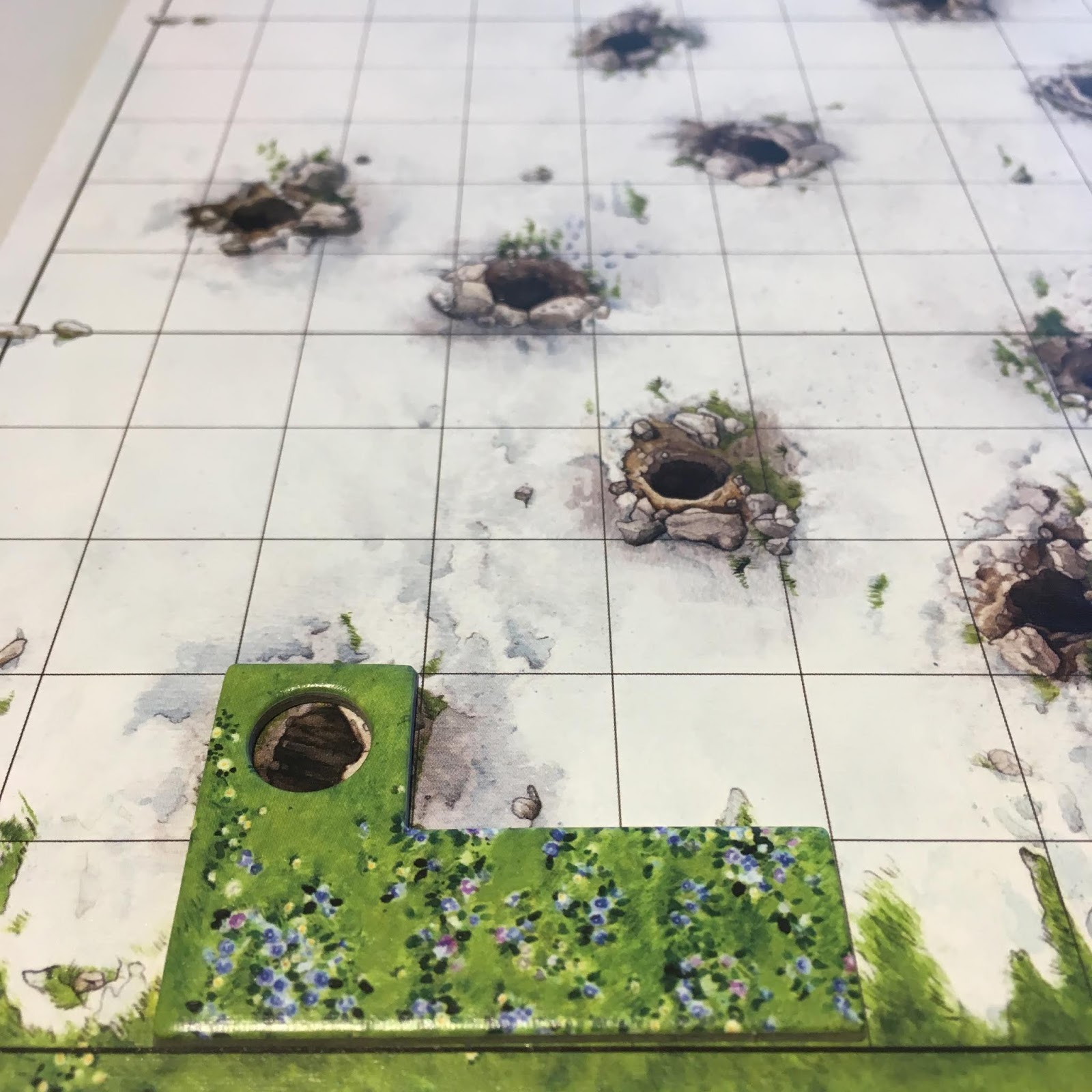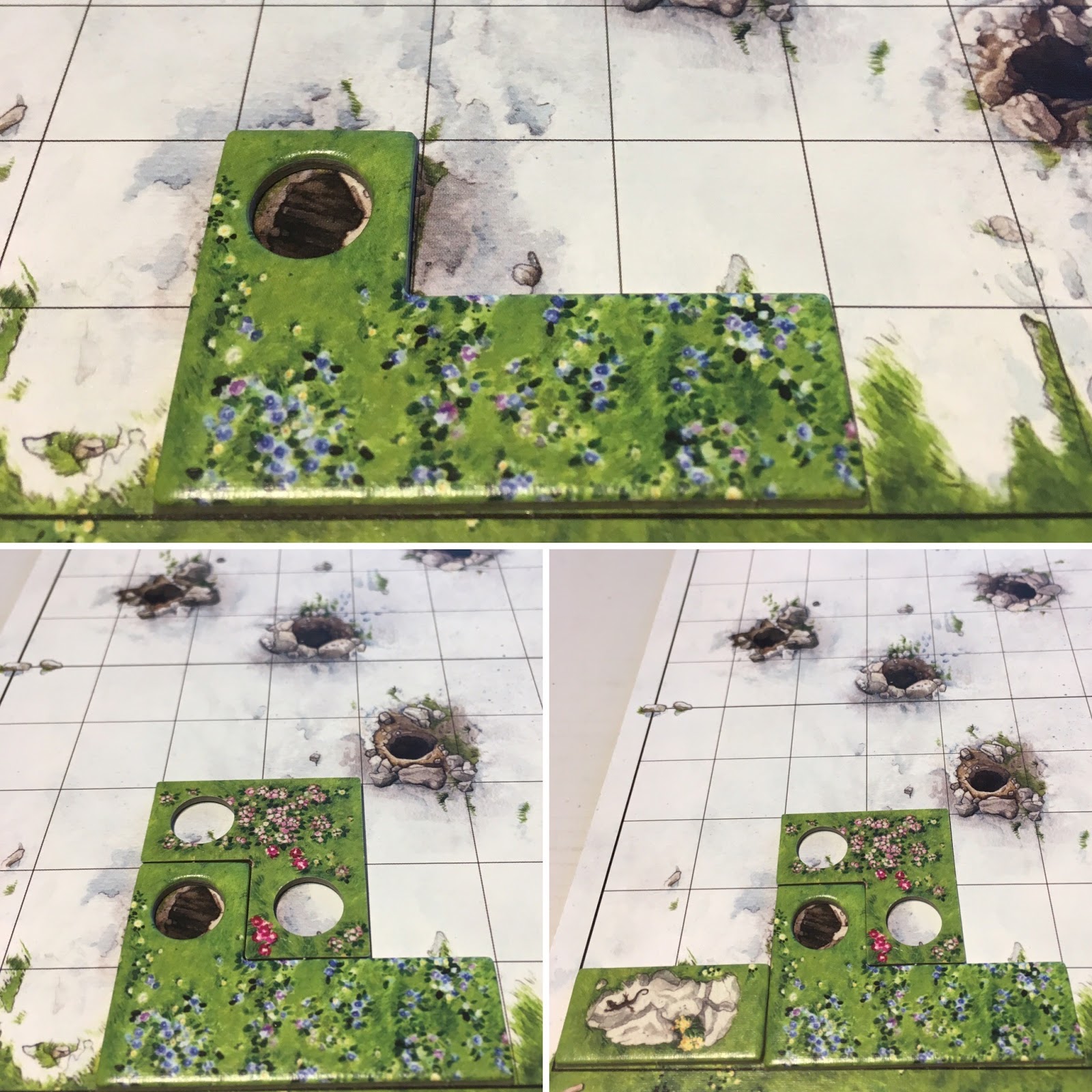 + -> sur votre plateau montagne, elles peuvent être retournées et pivotées dans tous les sens, placées adjacentes ou séparées, placer une tuile dont le trou coïncide avec un terrier.