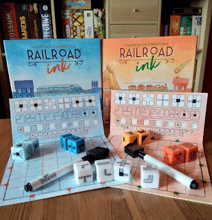 Particulièrement fan des roll & write, j’ai ramené Railroad Ink (la version rouge) du salon d’Essen en octobre. Le jeu avait d’ailleurs fait parler de lui lors du salon puisqu’il a terminé neuvième du classement GeekBuzz. Et il est arrivé en français durant le mois de mars chez Edge. Deux boîtes sont disponibles : une bleue et une rouge. Quelle différence ? Simplement les 2 mini-extensions présentes dans les boîtes. Mais le jeu de base reste le même dans les 2 boîtes.