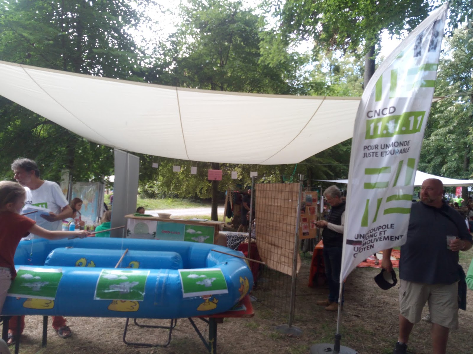 Finalement, sur le festival, il y a un espace qui rassemble différentes associations. Ici aussi, l’idée est de sensibiliser les festivaliers à diverses problématiques présentes dans nos sociétés : intégration des personnes handicapées, inégalité entre les pays, problèmes liés à nos sociétés capitalistes et plus ou moins démocratiques etc. Pas vraiment de rapport avec le jeu et pourtant… De nombreux stands utilisent le jeu pour inviter les gens à s’arrêter et pour débuter la discussion en douceur. Je n’ai pas eu le temps de faire un tour détaillé des lieux mais j’ai trouvé très amusant de sortir de l’Amusoir pour arriver face à un jeu de pêche aux canards customisé par le Centre national de coopération au développement.