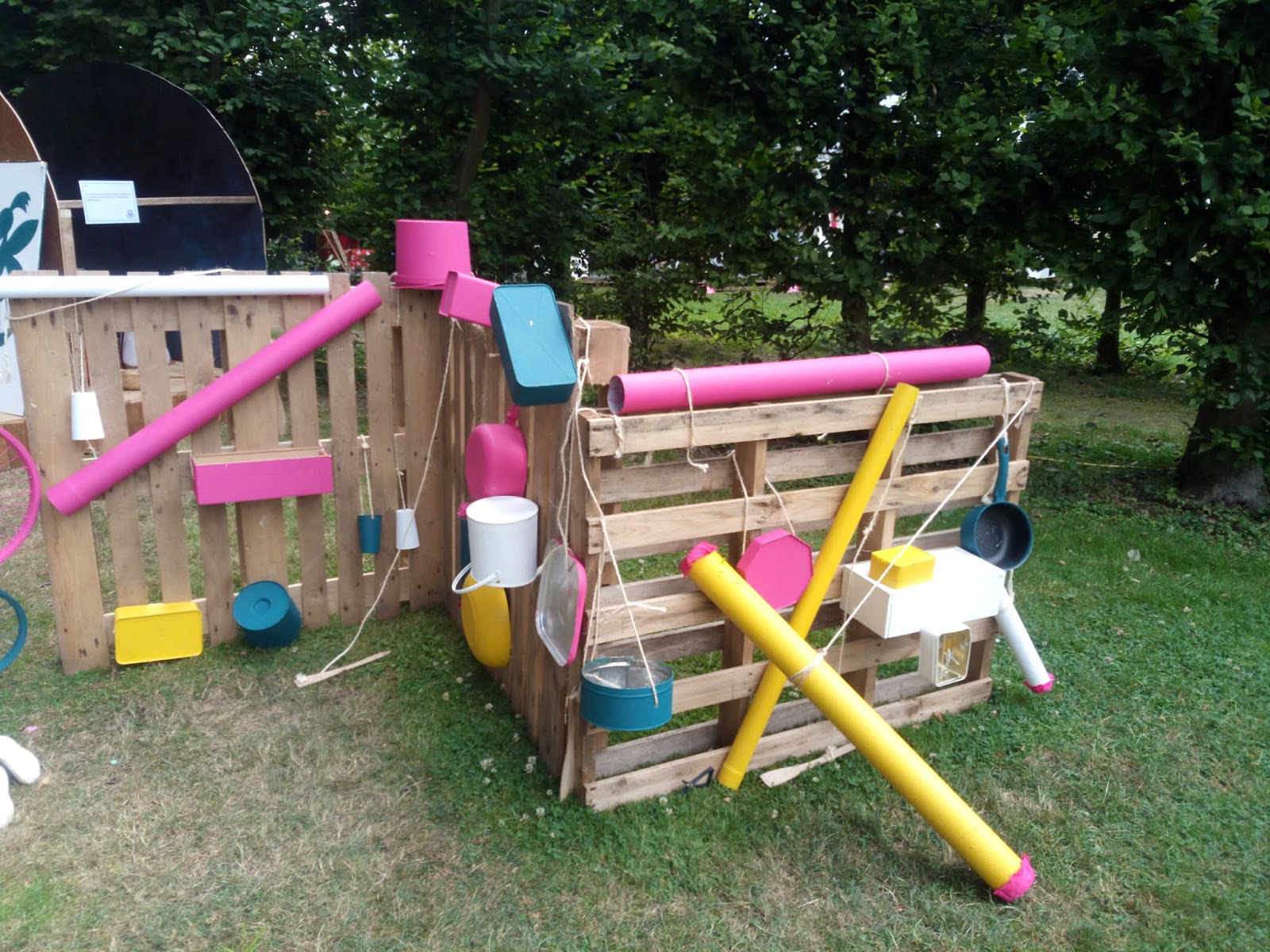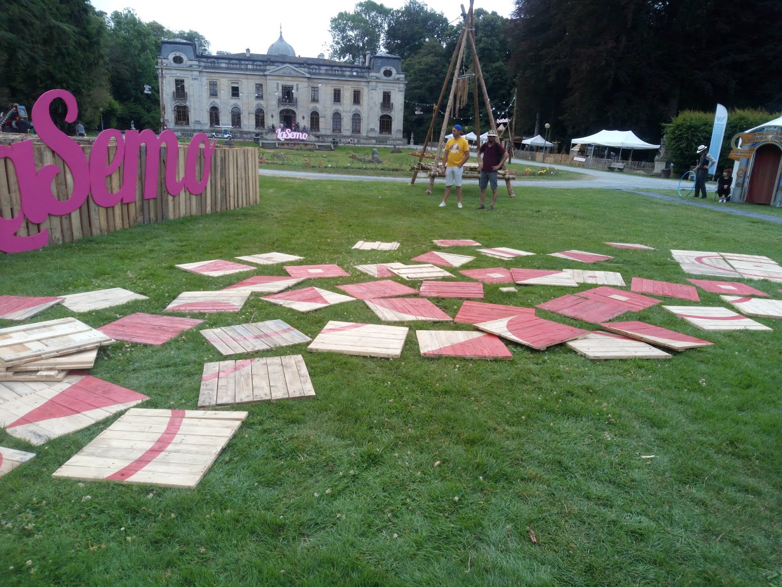 Bon, déjà, il faut noter que Lasemo se veut un festival éthique et avec une faible empreinte carbone. Ça se voit aussi dans le jeu. Dans l’Amusoir, derrière les jeux de société, il y a des jeux récup : un labyrinthe en palettes (une tradition aussi sur le festival) et un puzzle abstrait aux couleurs du festival, bois et rose.