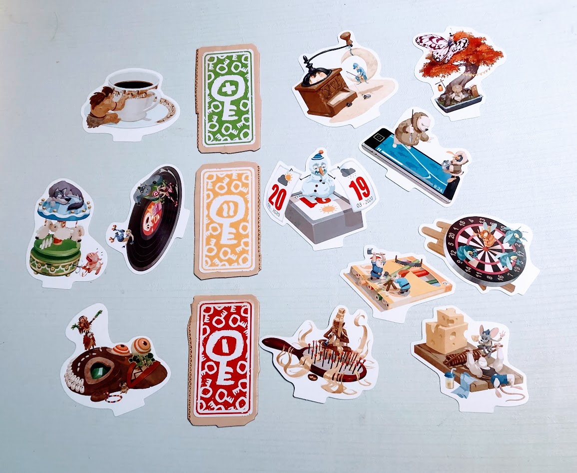 Lors du premier tour, le meneur pioche une image et la place à côté d’une des tuiles de couleur en fonction de s’il s’agit d’une carte qui correspond vraiment (dans ce cas, il pose à côté de la tuile verte), un petit peu (orange) ou pas du tout (rouge).