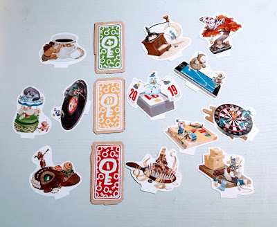 Au centre de la table seront posées les tuiles rouge, orange et verte, les 11 cartes sont posées à côté, ainsi que le compte-tours et son jeton et le ticket Bonus.