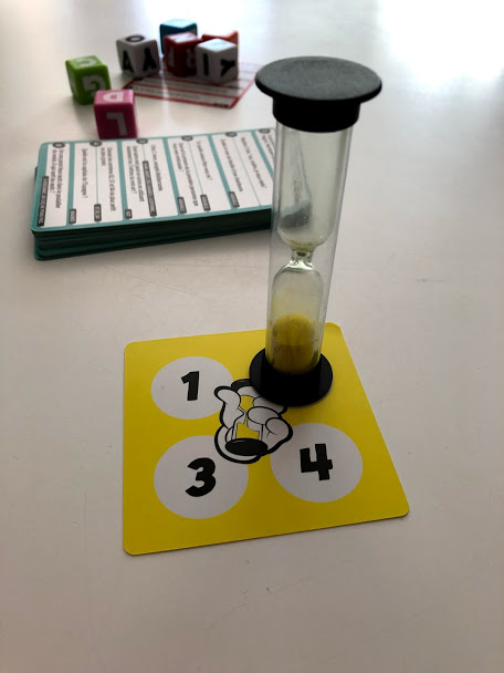 Enfin, au autre joueur sera maitre du sablier. Si vous jouez à 3, l’interrogateur écrit sera aussi maitre du sablier. Le sablier pourra couler 4x sur une manche, une petite carte vient vous aider à vous