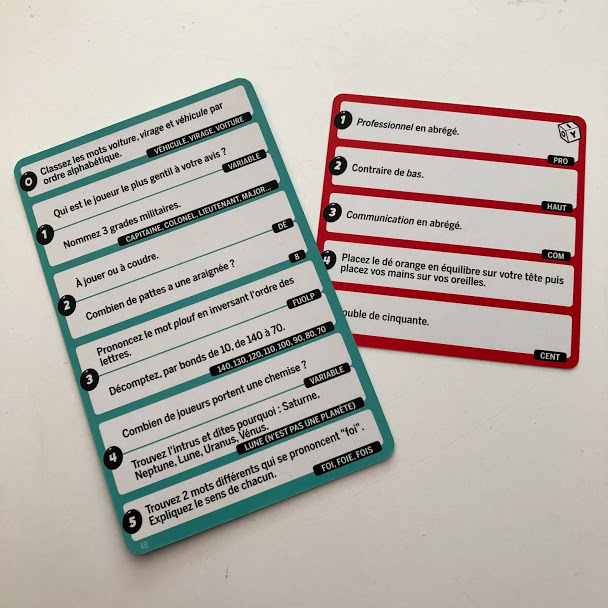 Par exemple, Roger a répondu correctement jusqu’à la question 3 sur la carte rouge (COM), et jusqu’à la première question de la ligne 4 sur la carte turquoise (évidemment, s’il a dit « variable », ça ne marche pas, il aura répondu en fonction) et remportera alors 12 points. Vous l’aurez compris, maximum 25 points par manche. |