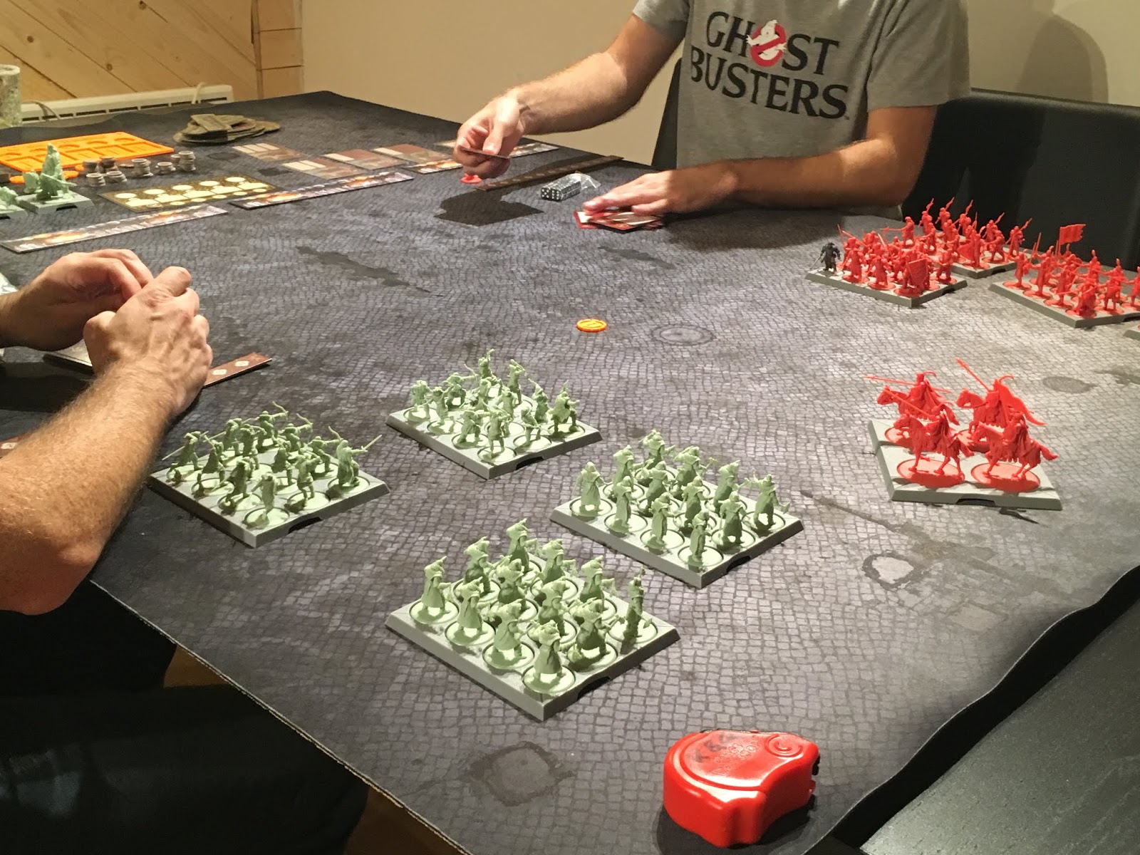 Nous nous installons. Je dĂ©couvre alors avec surprise quâil y a des jeux pour tous les goĂ»ts : ambiance, stratĂ©gie, co-op, du narratif et mĂȘme des tapis de jeu pour X-wings⊠Wow ! Je mâentends encore dire Ă mes amis : « Oh, ils ont Dead of Winter ! Oh ils ont Terraforming Mars ! Ils ont Time Stories, mon prĂ©fĂ©ré !!! On doit tous les essayer ! » Le geekomĂštre crĂšve le plafond !Â