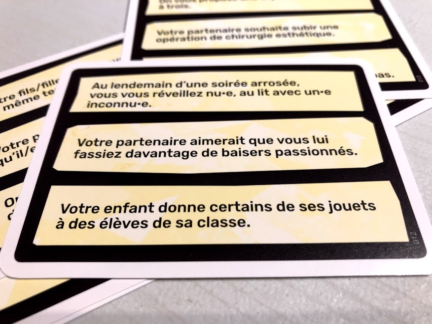 ça. Il s’agit d’un jeu à part entière, l’un n’a pas besoin de l’autre. Cette version est donc destinée aux +16 ans car les questions peuvent être coquines, de société, des questions qu’on ne posera pas à un enfant de 10 ans en tout cas. Les illustrations de cette version sont très différentes et très réussies, ça colle parfaitement au public ciblé. La seule chose que j’aurais aimée autrement, c’est que les jetons Joker soient de la même couleur que les jetons des joueurs, plutôt que noirs, n’oubliez donc pas qui a joué son Joker sur quel joueur 😉