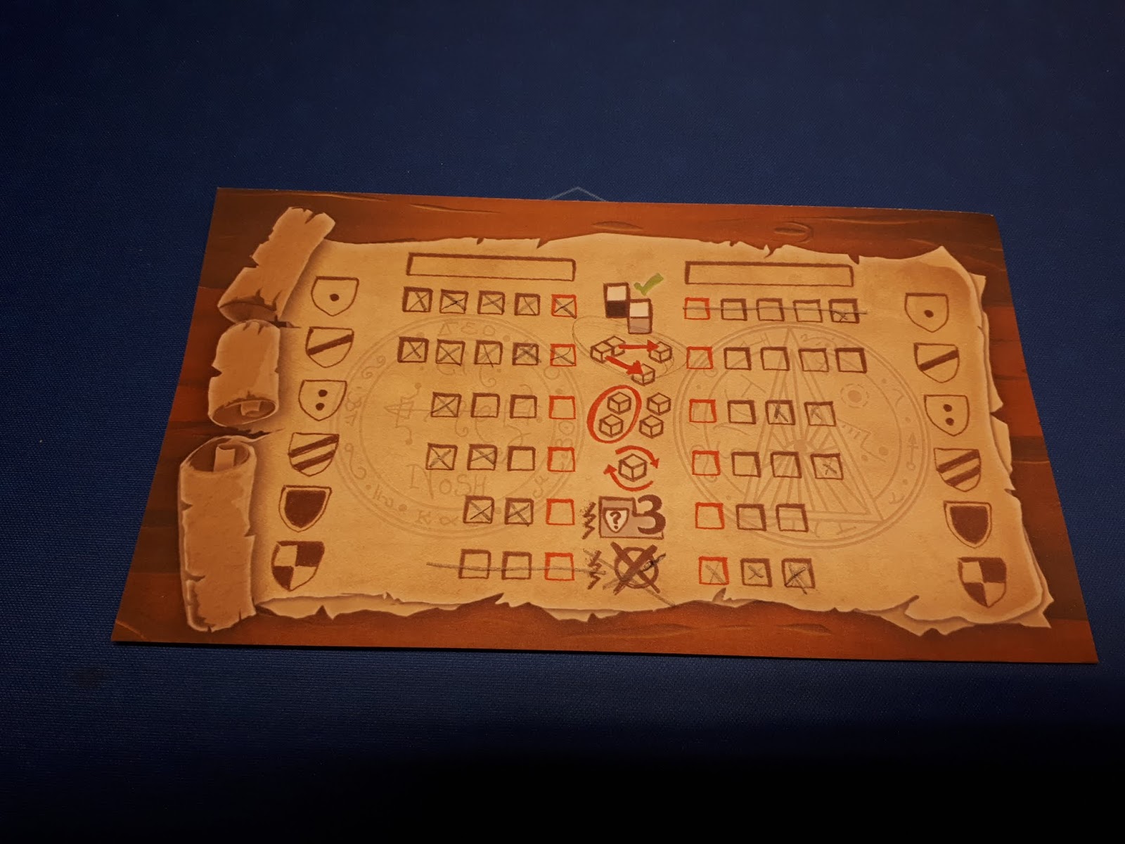 A chaque face blason sans croix que vous obtenez lors de la constitution des dominos, noircissez une case du Grimoire correspondant à cette face. Attention, chacun a sa propre ligne : le premier joueur à noircir une ligne complète peut bénéficier du pouvoir du sorcier (bonus).