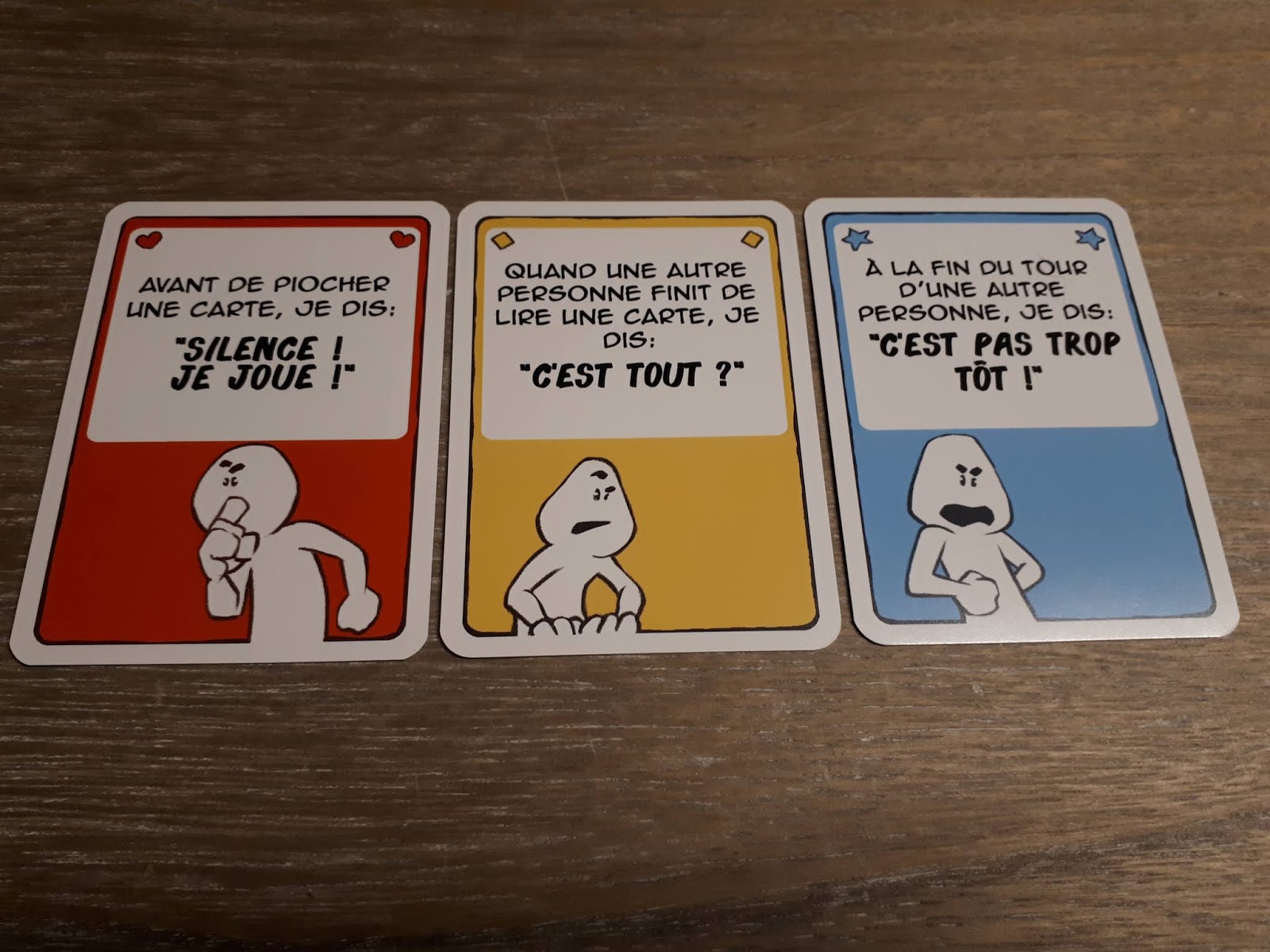C’est tout, me direz-vous ? Oui, sauf que… sauf que les cartes donnent des consignes qui doivent toujours être respectées… Les cartes horizontales sont des consignes pour tous, alors que les cartes verticales sont des consignes individuelles. La seule façon de faire cesser une contrainte est de recouvrir la carte par une autre carte de même couleur.
