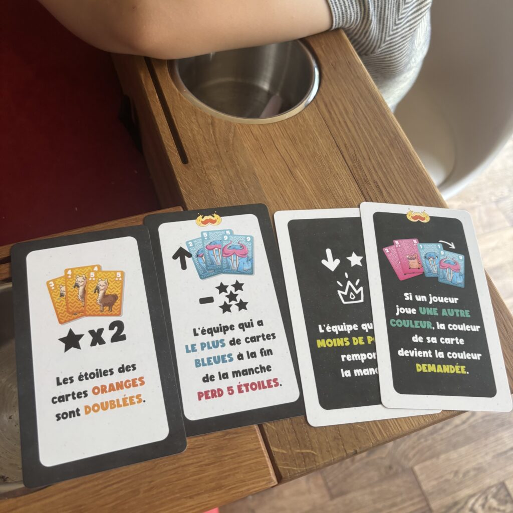 Exemple de règle modificatrice : on peut gagner en ayant le moins d’étoiles au lieu de l’inverse. Une autre règle est de suivre la couleur du joueur précédent même si tu as en main la couleur de la première carte jouée.