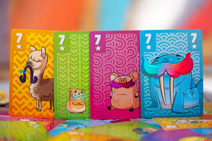 Moustache est un jeu de 44 cartes réparties entre quatre couleurs dont la valeur varie de zéro à 10. Les couleurs ont une hiérarchie et lorsqu’on joue la même couleur, c’est la valeur la plus grande qui gagne.