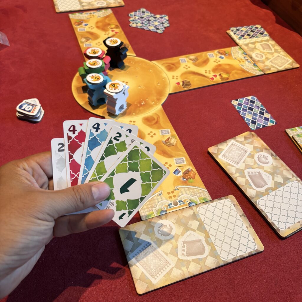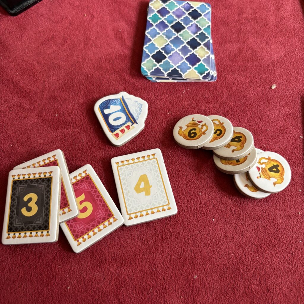 J’adore ce jeu ! Il y a vraiment plein d’interactions car on se dispute les mêmes chameaux. Quand tu as un chameau avec une théière de haute valeur, c’est tentant de jouer une grosse carte. Tu perds cependant ton tour si un autre joue la même couleur mais une valeur inférieure. Tu dois donc être prudent. Par ailleurs, tu dois tenir compte des cartes déjà jouées. Jouer gros quand les cartes faibles sont tombées est plus facile.
