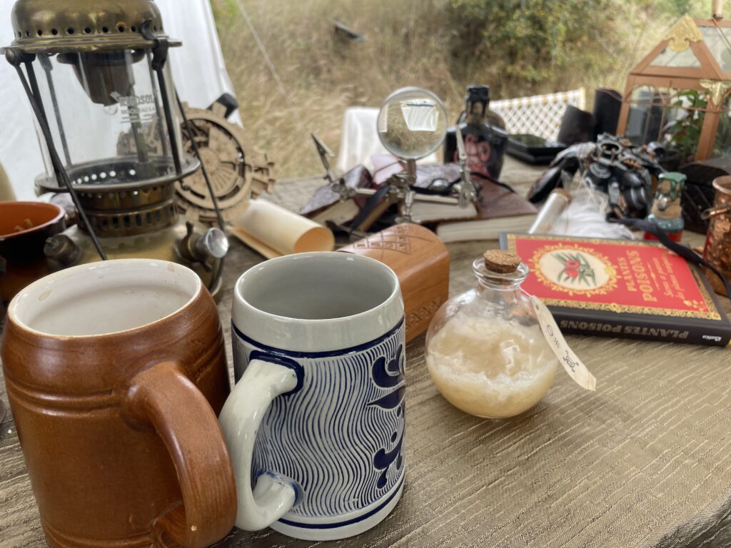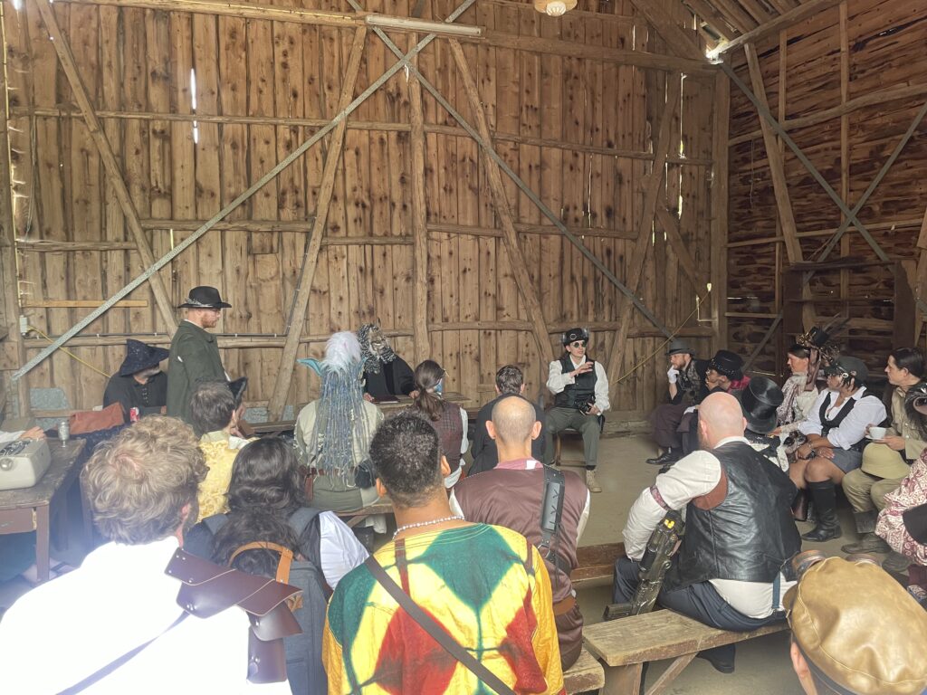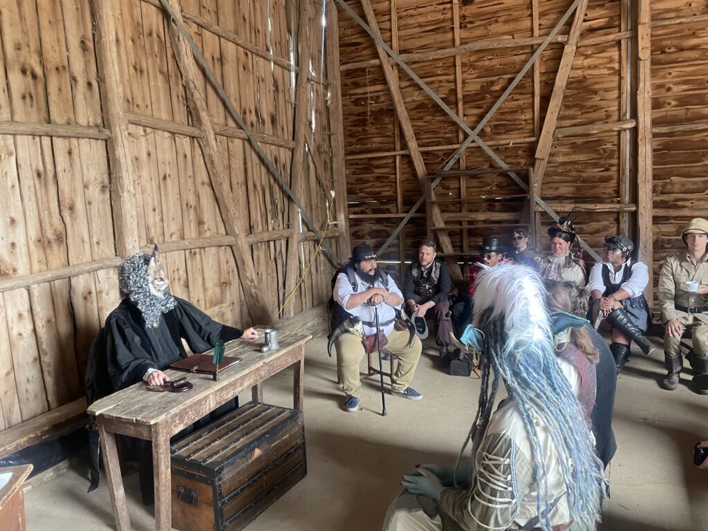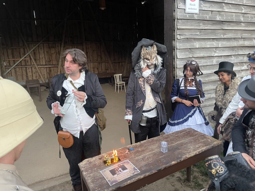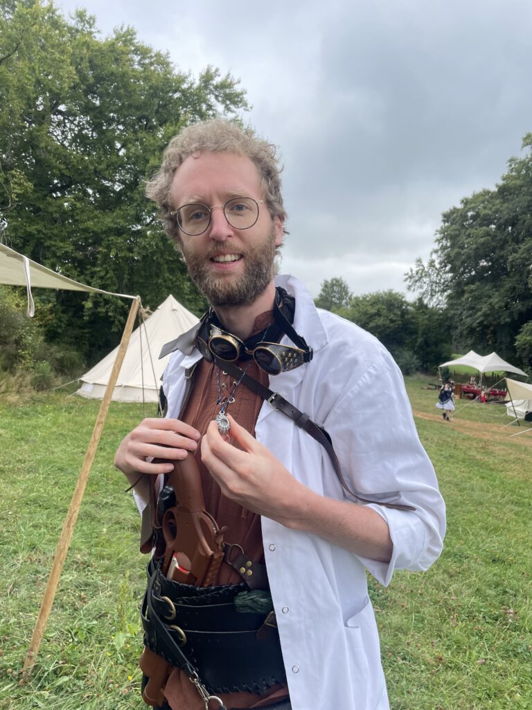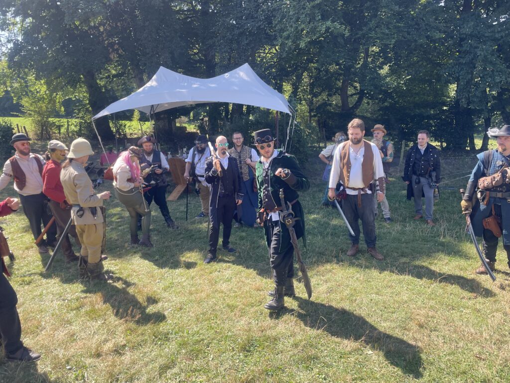 Nous étions plongés dans une exposition universelle d’inventions et de découvertes. Les guildes y présentaient leurs créations : machinerie pour zeppelin, huile rare, mitrailleuse Gatling, système de communication entre amoureux, coffre de refroidissement,… C’était foisonnant ! Et soudain, le jeu de rôle prit vie : une comtesse nous proposa de voler une machine en échange d’un titre et d’une belle récompense. L’affaire fut rapidement conclue. Après un passage remarqué à la taverne pour brouiller les pistes et nous fabriquer un alibi auprès du juge, un détachement de mon équipage vola habilement la machine avant de la mettre à l’abri.