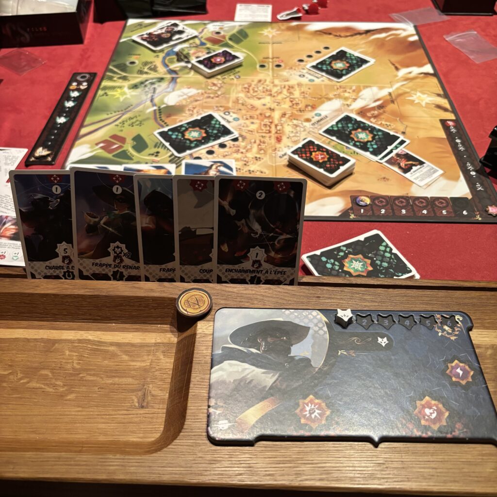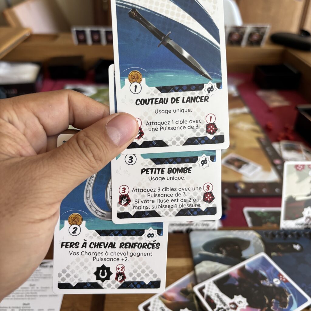 Quant au combat en lui-même, ce sont les joueurs sur la route résolue qui jouent des cartes combats pour vaincre les ennemis sur celle-ci. Les cartes reprennent les points de dégâts infligés, le nombre de cibles atteintes et le type d’attaque (épée, fouet, assaut à cheval, ruse). Sur ton plateau joueur, tu as tous les éléments à disposition pour mener ton combat : tes cartes attaques, tes cartes Bonus, tes équipements à usage unique ainsi que ta jauge de ruse qui inflige des dégâts en fonction de son niveau quand tu fais une attaque Ruse.