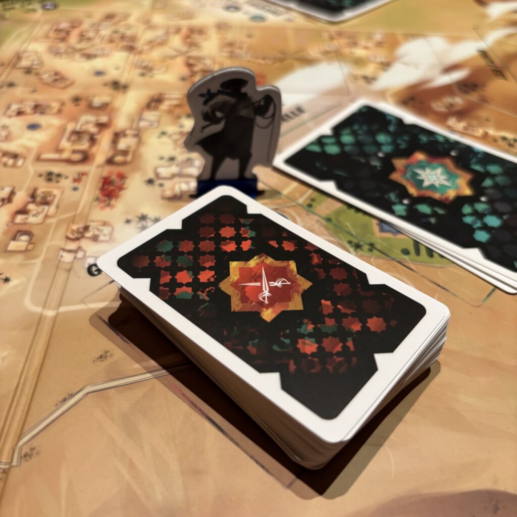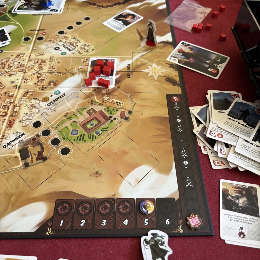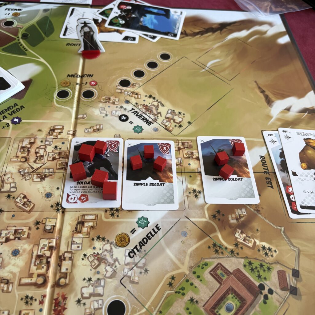 Avant de se positionner sur les routes, il se peut qu’il faille éliminer des soldats en patrouille dans la ville. Le nombre de soldats dépend de la jauge du Gouverneur qui se remplit ou se vide si on résout avec succès ou pas certains événements nocturnes. Ces patrouilles sont vraiment une crasse car tu dois d’abord les battre avant la phase Nuit. Tu devras donc déjà utiliser des cartes attaques. Or les cartes Attaque sont réutilisées à la prochaine manche. Il y a cependant des cartes événements qui permettent de récupérer des cartes jouées lors de la manche en cours mais elles sont rares …