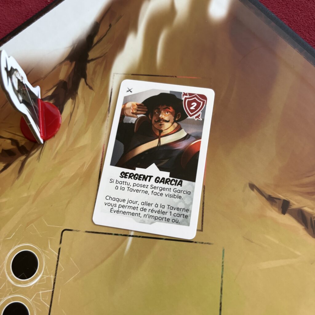 Sur papier, c’est un chouette coopératif avec un beau narratif où tu vas enrichir ta réserve de techniques à la Zorro avec ton fouet, ton épée et ton destrier. Il y a même le Sergent Vargas qui va t’aider si tu le bats une fois et te servira d’indic pour les événements. Cependant, j’ai vraiment une impression de déjà-vu quand j’y joue. Je peux en effet le comparer à Ghost Stories. On a aussi une phase de préparation et puis une phase où on résout les évènements et on combat les méchants.