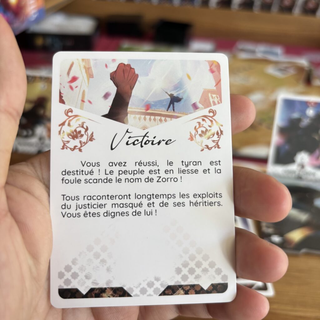 Pour conclure, Les Secrets de Zorro plaira aux nouveaux joueurs n’ayant pas l’habitude des coopératifs assez difficiles. C’est un jeu familial + où on perd mais pas de façon systématique comme on pourrait l’avoir avec Ghost Stories. Pour ma part, je suis sur un ratio 60 % victoire et 40 % car cela se complique au fil des chapitres.