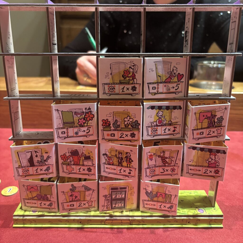 Dans la ville, ce n’est pas toujours facile de vivre en communauté ! Origames l’illustre en jeu avec Balconia où deux joueurs vont agencer au mieux les voisins de balcon. Celui qui optimise au mieux, sera vainqueur ! Un matériel en 2D qui donne vraiment envie avec un système de choix que j’ai trouvé très malin !
