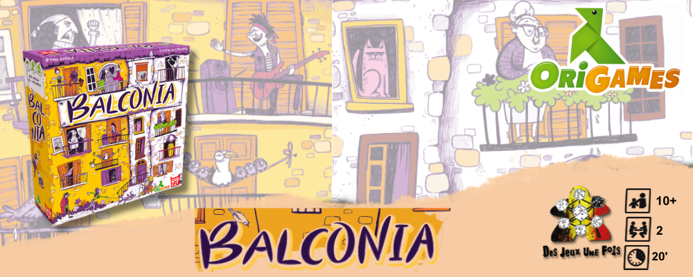 Dans la ville, ce n’est pas toujours facile de vivre en communauté ! Origames l’illustre en jeu avec Balconia où deux joueurs vont agencer au mieux les voisins de balcon. Celui qui optimise au mieux, sera vainqueur ! Un matériel en 2D qui donne vraiment envie avec un système de choix que j’ai trouvé très malin !
