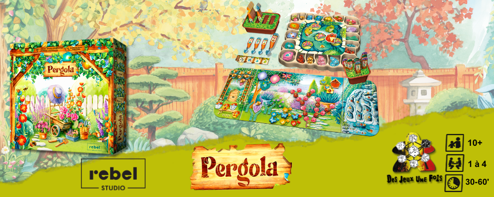 Un vrai jeu qui mêle mécanique et immersion thématique, c’est Pergola. Tu as plein de façons d’aménager ton jardin et ta pergola mais l’optimisation est la clé de la victoire !