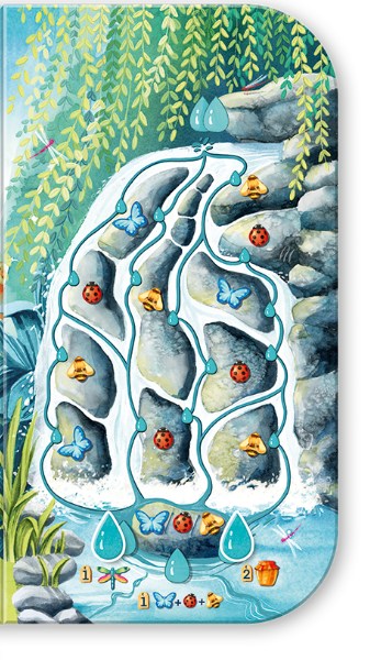 Chaque case d’arrivée de la goutte rapporte un insecte différent et quand on arrive au bout de la cascade, on gagne des points de collection (insectes de base, libellules ou miel).