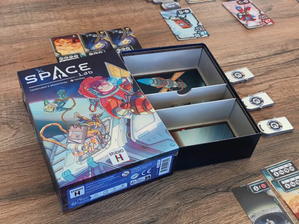 Nouveau jeu des auteurs de Faraway, Space Lab possède sa propre identité. Certes on y pose aussi des cartes, mais ici pas question de voyage zen, on est bien dans une course aux objectifs ! Cela donne un jeu rapide et interactif, rythmé par les joueurs eux-mêmes. Gardez un oeil attentif à la station de vos adversaires pour ne pas vous faire surprendre par la fin de partie. C’est un jeu qu’on sort facilement à la maison en tous cas !