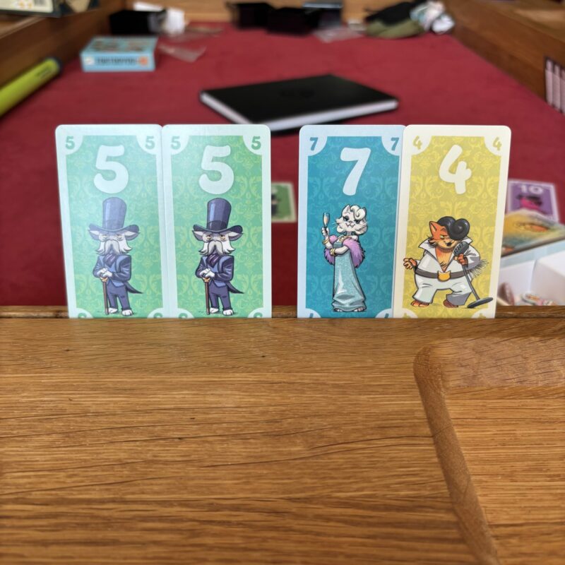 Par contre, si tu places une carte sur une colonne où il y a déjà une carte de la même valeur, tu n’as pas l’effet de suite mais un effet de collecte. Dans ce cas, tu prends toutes les cartes des colonnes directement adjacentes à celle où tu as placé ta deuxième carte. Chaque carte collectée rapporte un point en fin de partie.