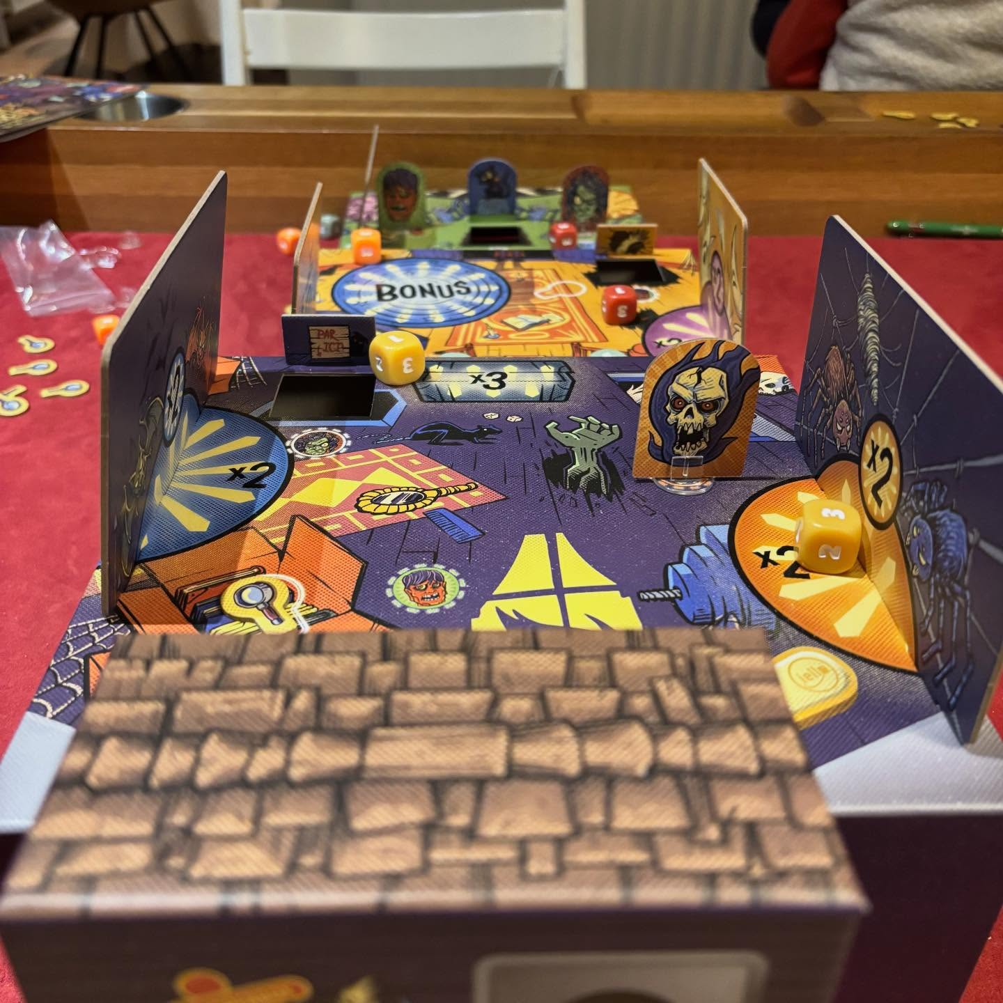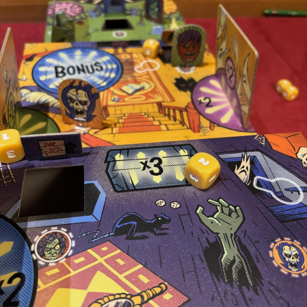 Il y a un peu de pétanque dans tout ça. Il est permis de toucher les dés adversaires afin qu’ils sortent du jeu ou touchent un monstre ou un indice. Ce n’est pas son propriétaire qui gagne la récompense mais bien le joueur dont c’est le tour. Il y a donc vraiment de la tactique derrière. Par exemple, je vais essayer d’éjecter le dé de Gabriel dont la face affiche « 3 » sur un multiplicateur x5.
