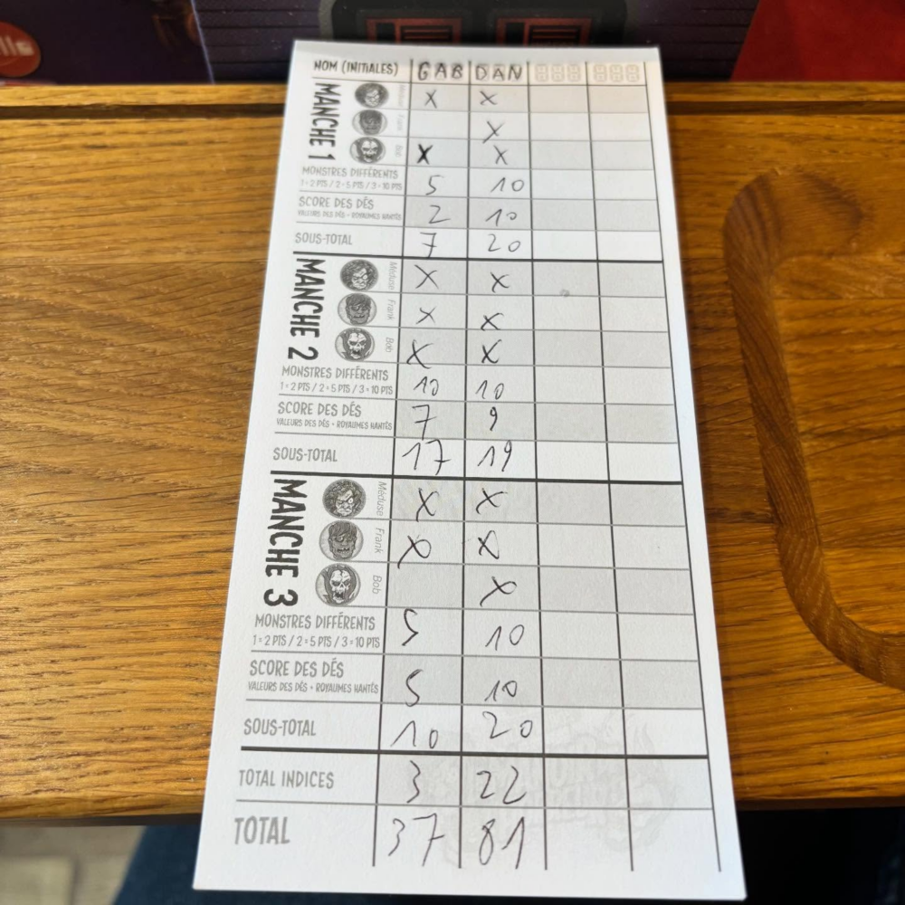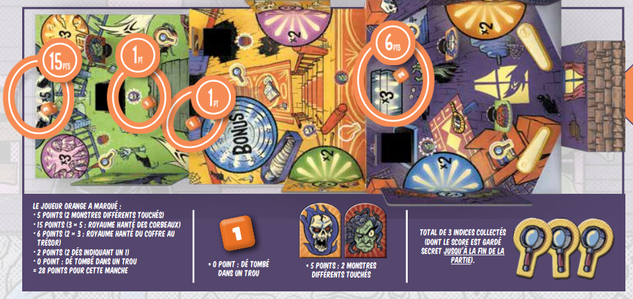 Quand tout le monde a joué tous ses dés, on passe au décompte. Si tu as touché 1, 2 ou 3 monstres différents, tu gagnes 2, 5 ou 10 points. Tu comptabilises ensuite les points de tes dés. Après la troisième manche, on ajoute les points des jetons indices.