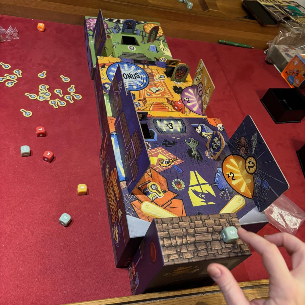 Le plateau en 3D, qui est chouette à monter, représente un flipper où tu dois essayer avec tes dés de toucher les trois monstres (Frank, Bob et Méduse) et atterrir sur des zones avec des multiplicateurs. Tu joueras trois manches et à chaque manche, tu feras des pichenettes avec 4 dés de ta couleur. Tu peux gagner jusqu’à 2 dés supplémentaires pour la manche si tu tombes sur la zone bonus.