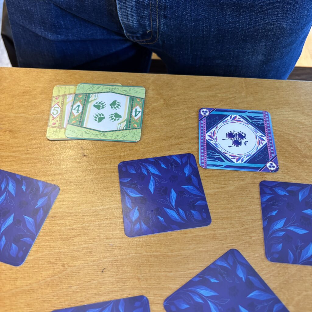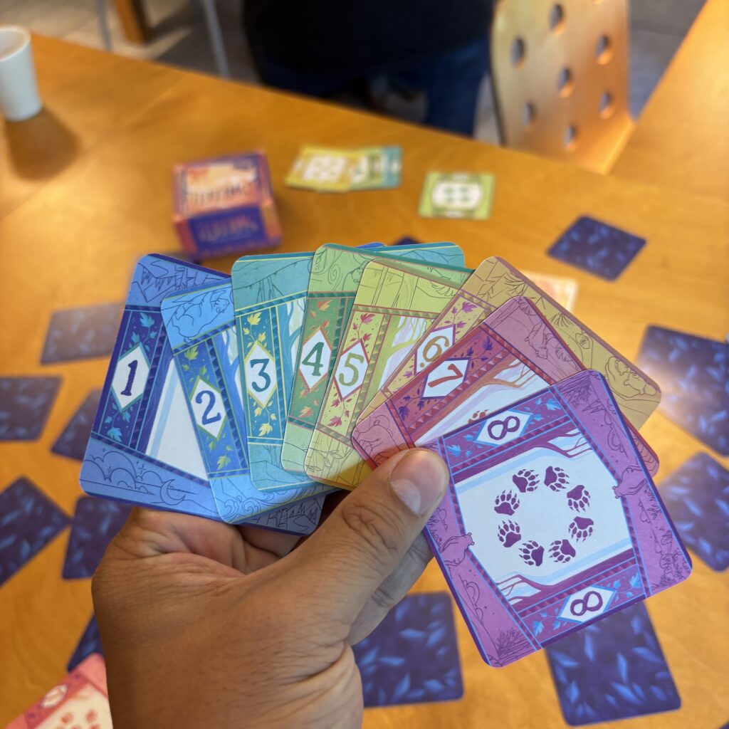 A ton tour, tu révèles une carte de ton choix et tu décides de t’arrêter ou de continuer à révéler. Si tu t’arrêtes, tu ne peux récupérer que les cartes qui complètent ta suite. Par exemple, si tu révèles un 4 et un 3 alors que tu as 7 et un 8, tu ne peux pas récupérer les deux cartes révélées. Tu dois continuer à révéler pour avoir le 5 et le 6 pour pouvoir les rattacher aux 7 et 8 que tu as.