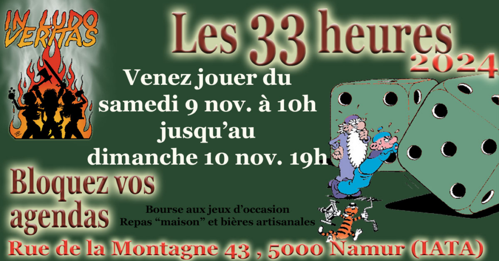 Cet évènement est organisé par le club In Ludo Veritas et dure 33 heures, du samedi 10 h au dimanche 19h. Ce sont des portes ouvertes pour découvrir le club et son immense ludothèque. C’est surtout l’occasion de jouer, manger et boire un coup, une fois ! Cela se déroule en général le deuxième week-end de novembre.